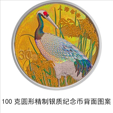 100克圓形銀質“人壽年豐”紀念幣背面圖案為鶴、水稻等裝飾組合圖案,并刊“人壽年豐”字樣及面額。