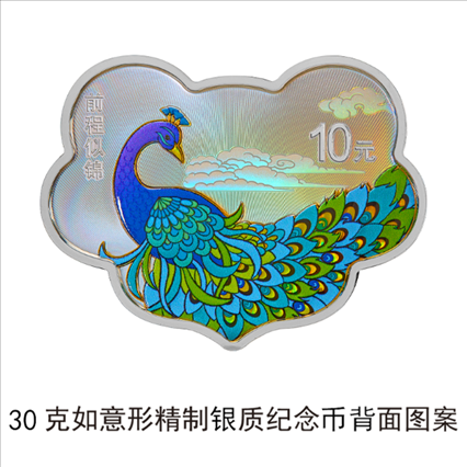 30克如意形銀質“前程似錦”紀念幣背面圖案為孔雀、祥云裝飾組合圖案,并刊“前程似錦”字樣及面額。