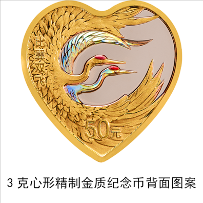 3克心形金質“比翼雙飛”紀念幣背面圖案為雙鶴齊飛裝飾組合圖案,并刊“比翼雙飛”字樣及面額。