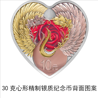 30克心形銀質“比翼雙飛”紀念幣背面圖案為雙鳥、玫瑰、百合等裝飾組合圖案,并刊“比翼雙飛”字樣及面額。