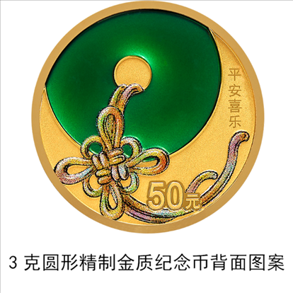 3克圓形金質“平安喜樂”紀念幣背面圖案為平安扣、中國結裝飾組合圖案,并刊“平安喜樂”字樣及面額。