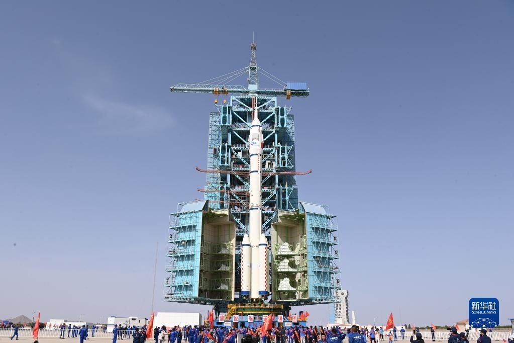 5月22日,神舟十六號載人飛船與長征二號F遙十六運(yùn)載火箭組合體轉(zhuǎn)運(yùn)至發(fā)射塔架。新華社發(fā)(汪江波 攝)