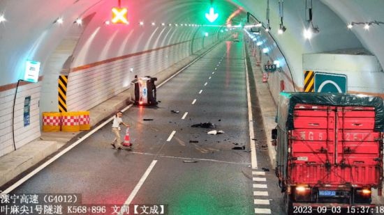 9月3日下午,在G4012溧寧高速葉麻尖隧道內(nèi),一輛小車碰撞隧道右側(cè)檢修帶,發(fā)生側(cè)翻,零部件散落一地。車內(nèi)3人被困,無(wú)法脫身,情況十分危險(xiǎn)。1分鐘后,一輛牌照為浙G52FJ2的貨車經(jīng)過(guò),司機(jī)李平江師傅見(jiàn)狀,立即把車停在緊急停車帶內(nèi),迅速下車并拿起隧道一側(cè)的隔離錐放在事故車后,用手勢(shì)示意后方來(lái)車減速慢行,防止二次事故發(fā)生。