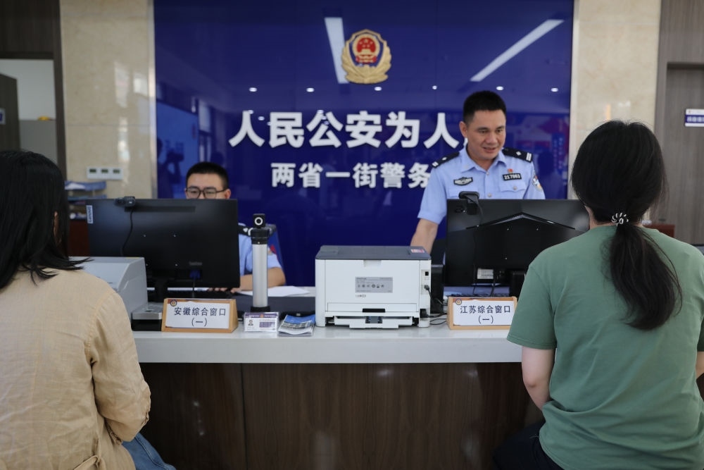 2023年6月2日,安徽的輔警(左二)和江蘇的民警(右二)在丹陽(yáng)警務(wù)室政務(wù)服務(wù)窗口為人們辦理業(yè)務(wù)。安徽馬鞍山博望區(qū)丹陽(yáng)鎮(zhèn)與江蘇南京江寧區(qū)丹陽(yáng)社區(qū)相毗鄰,2023年年2月底,蘇皖“兩省一街”丹陽(yáng)警務(wù)室政務(wù)服務(wù)窗口正式揭牌,在兩地交界區(qū)域?qū)嶓w化運(yùn)行。新華社記者 杜瀟逸 攝