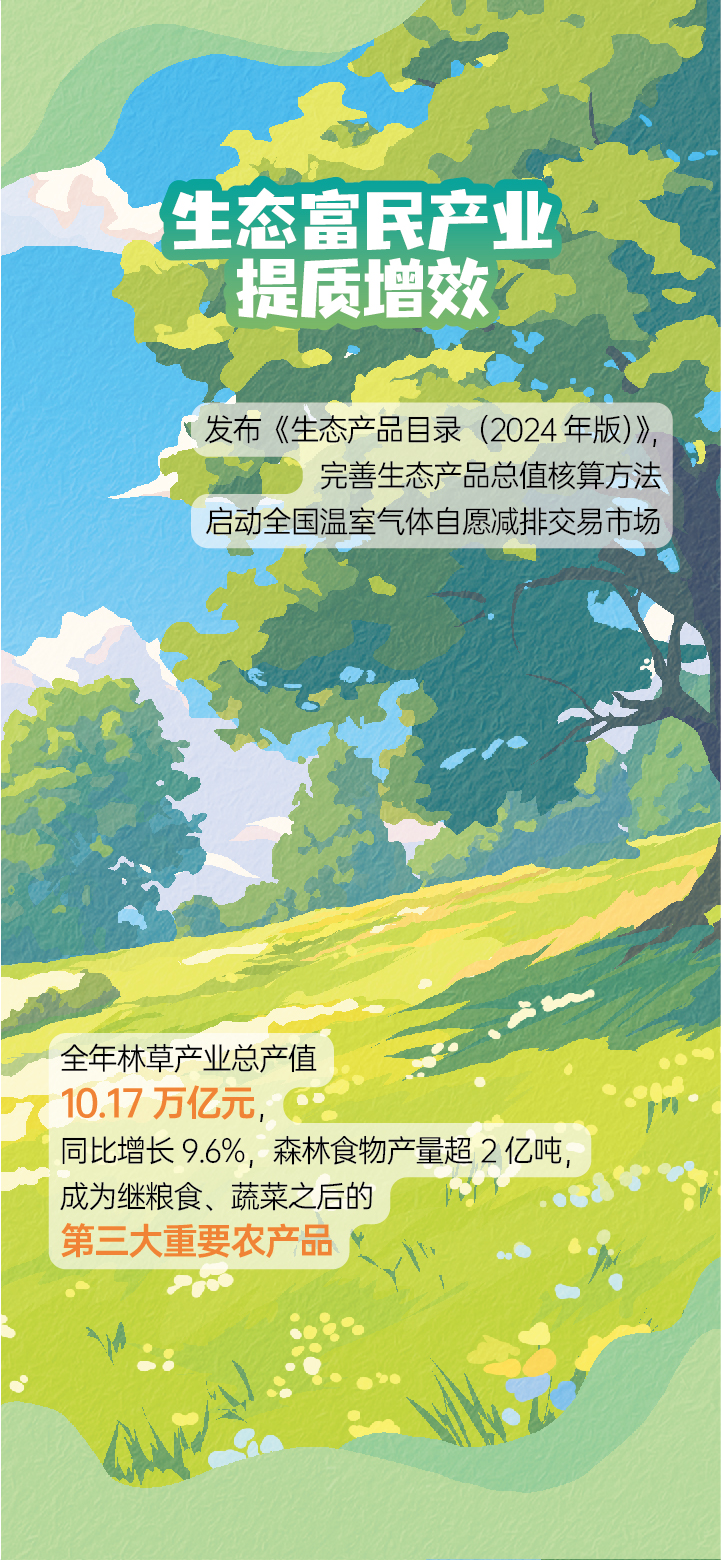 “我們持續(xù)深化改革,推進(jìn)生態(tài)富民產(chǎn)業(yè)提質(zhì)增效?!睆埨髡f,全年林草產(chǎn)業(yè)總產(chǎn)值10.17萬億元,同比增長(zhǎng)9.6%,森林食物產(chǎn)量超2億噸,成為繼糧食、蔬菜之后的第三大重要農(nóng)產(chǎn)品。