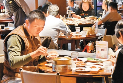 顧客在全聚德烤鴨北京和平門總店品嘗掛爐烤鴨。