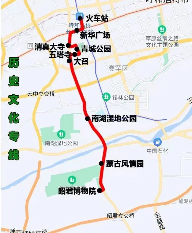 歷史文化專線(火車站——昭君博物院)途經(jīng):錫林北路、新華大街、通道南路、中山西路、石羊橋路、大東街、大北街、大南街、昭君路。沿途設(shè)站:火車站、新華廣場、清真大寺、青城公園、五塔寺、大召、南湖濕地公園、蒙古風(fēng)情園、昭君博物院,單程:17.2公里,配車:8臺(tái)。