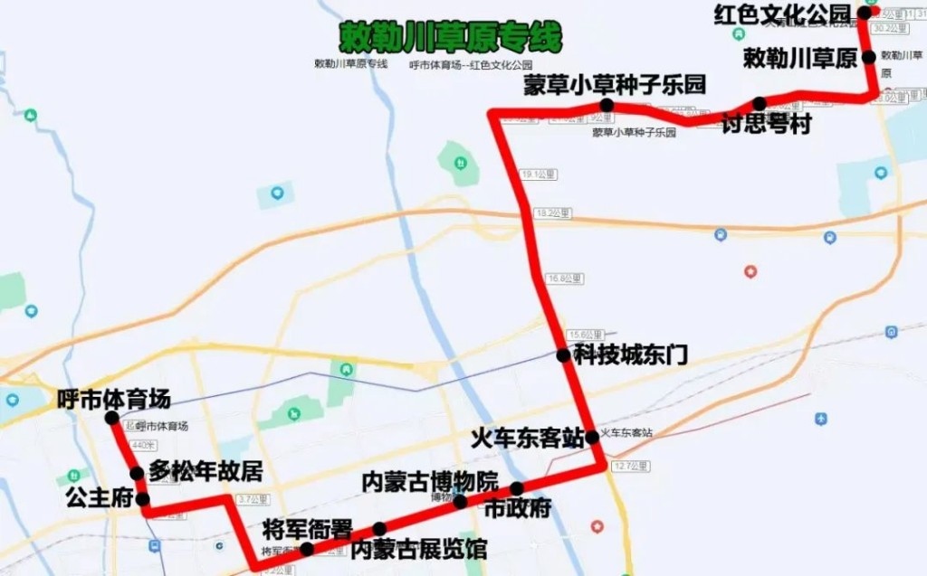 敕勒川草原專線(呼市體育場——紅色文化公園)途經(jīng):氣象局西巷、海拉爾西街、呼倫南路、新華大街、新華東街、科爾沁北路輔道、呼和塔拉西街、呼和塔拉東街、野馬圖、Y371。沿途設(shè)站:呼市體育場、多松年故居、公主府、將軍衙署、內(nèi)蒙古展覽館、內(nèi)蒙古博物院、市政府、火車東客站、科技城東門、蒙草小草種子樂園、討思號(hào)村、敕勒川草原、紅色文化公園,單程:30.5公里,配車:8—10臺(tái)。