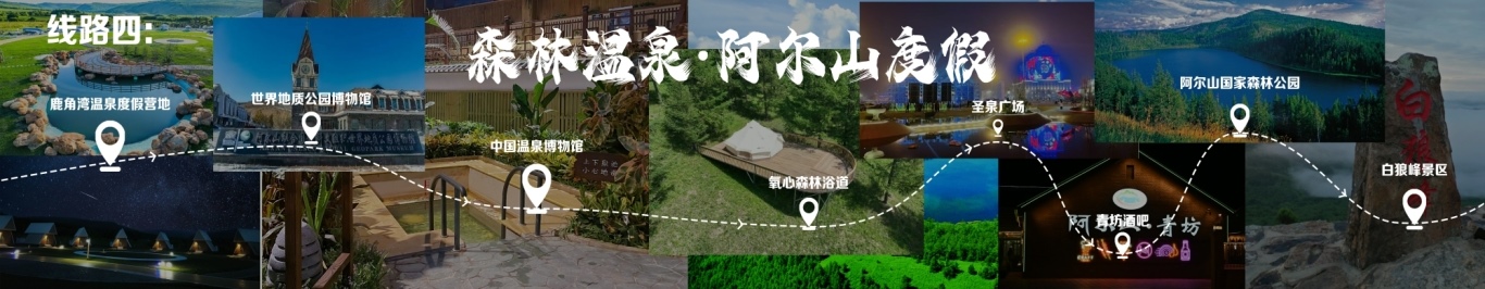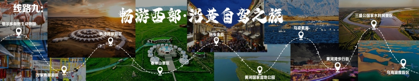 “一城看北疆?大美青城”四日游 行程由呼和浩特出發(fā),至哈達(dá)門高山草原旅游區(qū),至莫尼山非遺小鎮(zhèn),至大召歷史文化旅游區(qū),再至昭君博物院,再至奧威馬文化生態(tài)旅游區(qū),再至蒙草草博園,再至老牛坡紅色文化旅游區(qū),終點(diǎn)為老牛灣黃河大峽谷旅游區(qū)。 線路二 “醉美草原·呼倫貝爾”五日游 線路行程由海拉爾出發(fā),至呼倫貝爾大草原·莫爾格勒河景區(qū),至烏蘭山,至額爾古納濕地,再至白樺林,再至呼和諾爾旅游區(qū),終點(diǎn)為呼倫貝爾古城旅游休閑街區(qū)。 線路三 “邊境風(fēng)情·環(huán)興安嶺自駕之旅”四日游 線路行程由烏蘭浩特出發(fā),至翰嘎利湖休閑旅游度假區(qū)出發(fā),再至紅花爾基樟子松林國(guó)家森林旅游區(qū),再至諾干湖旅游度假區(qū),再至扎賚諾爾猛犸旅游區(qū),終點(diǎn)為滿洲里市中俄邊境旅游區(qū)。 線路四 “森林溫泉·阿爾山度假”三日游 線路行程由阿爾山出發(fā),至鹿角灣溫泉度假營(yíng)地,至世界地質(zhì)公園博物館,至中國(guó)溫泉博物館,再至氧心森林浴道,再至圣泉廣場(chǎng),再至青坊酒吧,再至阿爾山國(guó)家森林公園,終點(diǎn)為白狼峰景區(qū)。 線路五 “勝境探秘·科爾沁草原”三日游 線路行程由通遼出發(fā),至科爾沁左翼中旗探訪哈民考古遺址公園,至珠日河草原旅游區(qū),再至科左后旗大青溝旅游區(qū),終點(diǎn)為庫(kù)倫旗銀沙灣旅游區(qū)。 線路六 “玉龍故里·紅山印記”三日游 線路行程由赤峰出發(fā),至赤峰博物館,至玉龍沙湖國(guó)際生態(tài)文化旅游區(qū),再至克什克騰旗熱水塘溫泉小鎮(zhèn),終點(diǎn)為阿斯哈圖石林。 線路七 “草原追夢(mèng)·暢游錫林郭勒”三日游 線路行程由錫林浩特出發(fā),至貝子廟旅游景區(qū),至烏蘭烏臺(tái)旅游區(qū),至布林泉,再至野狼谷,終點(diǎn)為九曲灣景區(qū)。 線路八 “北京向西一步·草原避暑之旅”四日游 線路行程由北京出發(fā),至烏蘭哈達(dá)火山,至二連浩特國(guó)家地質(zhì)公園,至輝騰錫勒草原,至林胡古塞,再至集寧戰(zhàn)役紀(jì)念館,再至烏蘭察布之夜,終點(diǎn)為蘇木山旅游區(qū)。 線路九 “暢游西部·沿黃自駕之旅”五日游 線路行程由鄂爾多斯出發(fā),至鄂爾多斯野生動(dòng)物園,至萬家惠旅游區(qū),至響沙灣旅游區(qū)。到達(dá)包頭,至春坤山景區(qū),再至包頭金街,至黃河國(guó)家濕地公園。到達(dá)巴彥淖爾,至烏梁素海,再至黃河灣步行街,再至三盛公國(guó)家水利風(fēng)景區(qū),終點(diǎn)為烏海湖度假區(qū)。 線路十 “沙漠傳奇·巴丹吉林沙漠探險(xiǎn)之旅”四日游 線路行程由阿拉善出發(fā),至參觀越野e族阿拉善夢(mèng)想沙漠汽車航空樂園景區(qū),至定遠(yuǎn)營(yíng)古城旅游區(qū),至巴丹吉林沙漠景區(qū),再至額濟(jì)納旗東風(fēng)航天城旅游區(qū),再至居延海景區(qū),終點(diǎn)為胡楊林旅游區(qū)。