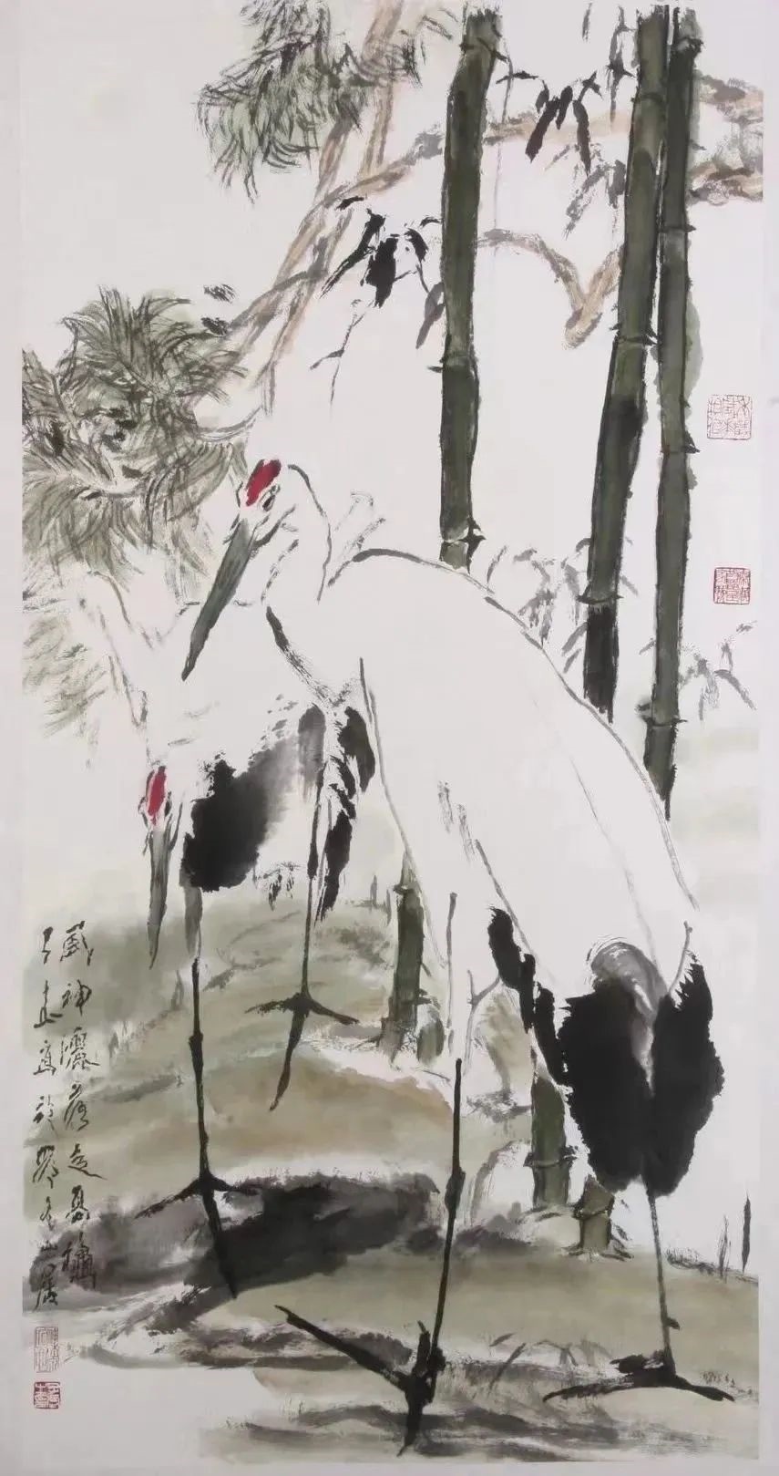 仙鶴是王子武鐘愛(ài)的動(dòng)物題材?!讹L(fēng)神灑落占高秋》是王子武晚年畫(huà)仙鶴喜歡使用的畫(huà)作名稱(chēng)?!坝鹨砉饷髌鄯e雪,風(fēng)神灑落占高秋。”出自唐代鄭谷的詩(shī)《鶴》,形容仙鶴高潔,寄托了詩(shī)人高逸瀟灑的情懷。