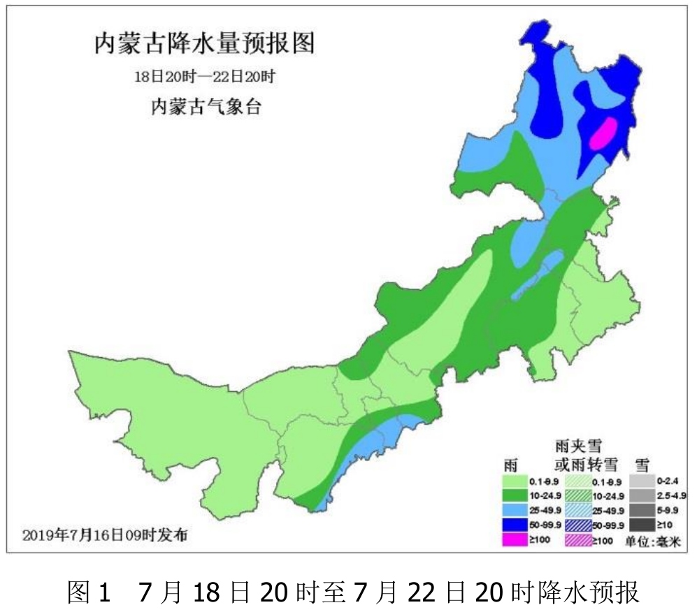 具體預(yù)報(bào)如下:7月18日20時(shí)至22日20時(shí),全區(qū)大部有降水,累積降水量0.1~9.9毫米;鄂爾多斯市東部、包頭市東南部和北部、呼和浩特市中南部、烏蘭察布市南部、錫林郭勒盟東部、北部和南部、赤峰市西部和北部、通遼市北部、興安盟大部、呼倫貝爾市大部累積降水量10~24.9毫米;鄂爾多斯市東北部、呼和浩特市南部、烏蘭察布市西南部、錫林郭勒盟東北部、赤峰市北部部分地區(qū)、通遼市北部部分地區(qū)、興安盟西北部部分地區(qū)、呼倫貝爾市大部累積降水量 25~49.9毫米;呼倫貝爾市北部和東部部分地區(qū)累積降水量50~99.9毫米,呼倫貝爾市東部偏南部分地區(qū)累積降水量 100毫米以上(見圖 1)。