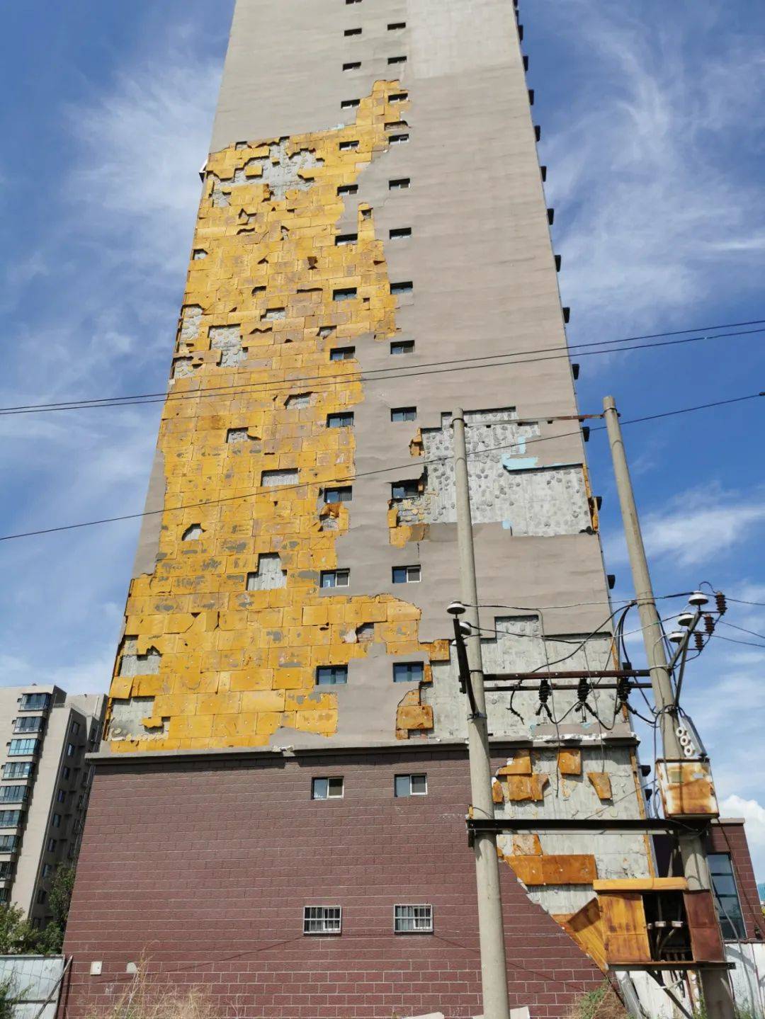 7月1日10時許,記者來到聞都雅苑4號樓下,抬頭望去,該棟樓西側墻壁有三處地方出現(xiàn)破損,大片的墻皮和里面的保溫層均已脫落。記者注意到,聞都雅苑共有4棟高層,該小區(qū)只有東西和南北兩條主干道以及西側一條小走廊,而4號樓正好位于南北主干道一側。據(jù)小區(qū)居民郝先生介紹,不斷掉落的保溫層已經威脅到了居民的人身安全。今年5月6日,呼和浩特市出現(xiàn)大風天氣,在風力的作用下,4號樓東西兩側的外墻保溫層出現(xiàn)大面積脫落,一位恰巧路過4號樓西側的女性業(yè)主不幸被掉落的材料砸中,導致腿部受傷,此事也給小區(qū)居民帶來了恐慌。