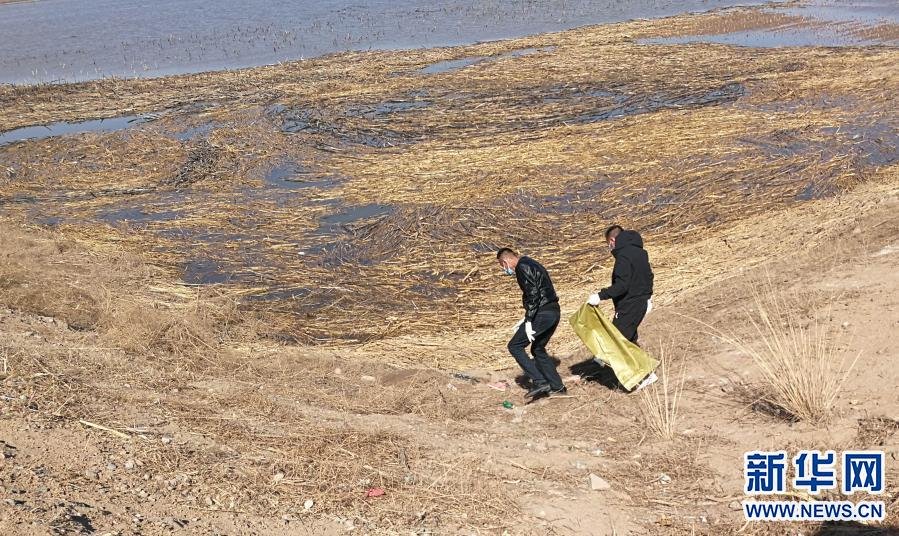 3月21日,當?shù)卣块T派出的工作人員在達拉特旗黃河國堤內(nèi)收集死畜。新華社發(fā)