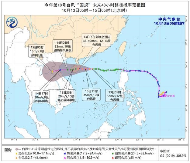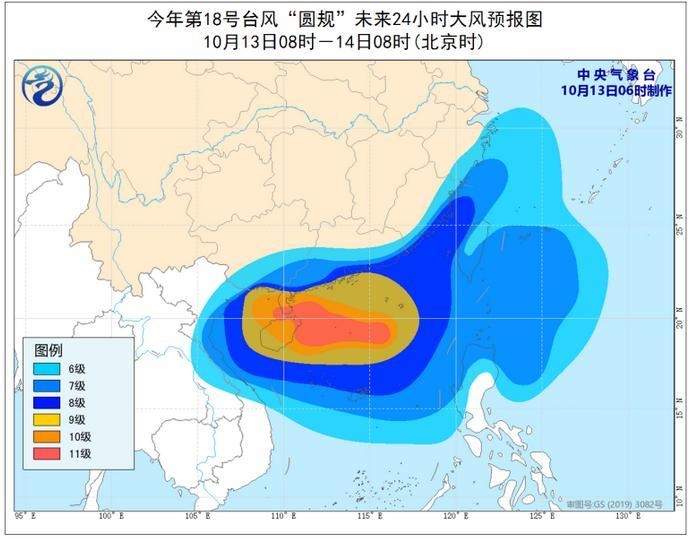 大風預(yù)報:13日08時至14日08時,東海西部和南部、臺灣以東洋面、臺灣海峽、巴士海峽、南海中部和北部、北部灣、瓊州海峽、西沙群島、中沙群島和黃巖島附近海域,以及浙江沿海、福建沿海、廣東沿海、廣西沿海和海南島及其沿海將有6-8級、陣風9-10級的大風,其中南海西北部、瓊州海峽、北部灣、廣東西部沿海及雷州半島、海南島及其沿海等地的部分海域或地區(qū)的風力可達9-11級、陣風11-13級,“圓規(guī)”中心經(jīng)過的附近海域或地區(qū)的風力有12-13級,陣風可達14-16級。