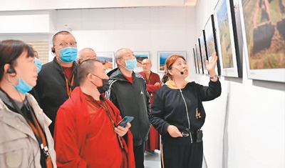 內蒙古明長城科普攝影展在內蒙古展覽館開展,高曉梅(右一)向觀眾做介紹。