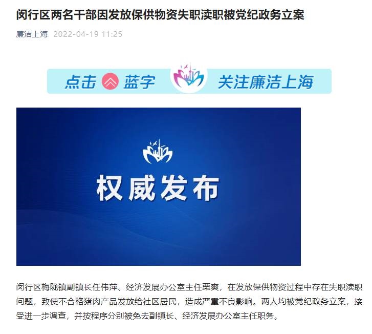 閔行區(qū)梅隴鎮(zhèn)副鎮(zhèn)長任偉萍、經(jīng)濟發(fā)展辦公室主任栗爽,在發(fā)放保供物資過程中存在失職瀆職問題,致使不合格豬肉產(chǎn)品發(fā)放給社區(qū)居民,造成嚴重不良影響。兩人均被黨紀政務立案,接受進一步調(diào)查,并按程序分別被免去副鎮(zhèn)長、經(jīng)濟發(fā)展辦公室主任職務。