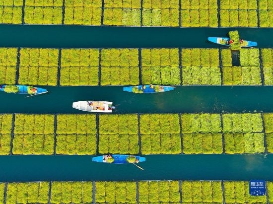 近年來,浙江省杭州市淳安縣在千島湖典型庫灣、入湖口等區(qū)域,積極運用生態(tài)浮島水上植物無土栽培技術(shù)種植空心菜、水芹菜等水生蔬菜,直接吸收庫區(qū)水體中氮磷等元素,從而能夠有效地降低水體中營養(yǎng)物質(zhì)的含量,提升水質(zhì)。近日,水生蔬菜進入采收季節(jié),“湖上菜園”呈現(xiàn)春收繁忙景象。