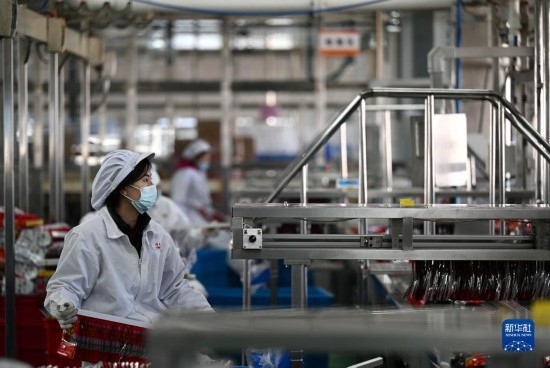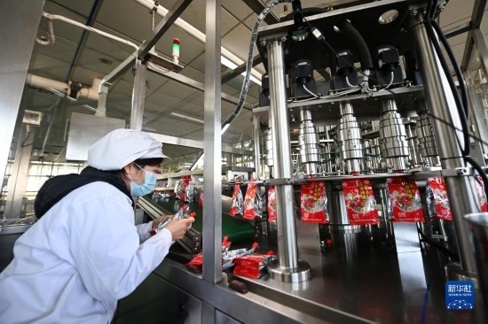 在天津市利民調料有限公司辣醬灌裝生產(chǎn)線,工作人員在檢查產(chǎn)品包裝(2月20日攝)。