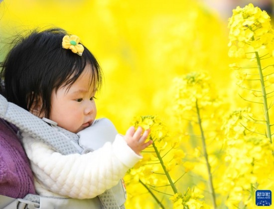 3月5日,在四川省崇州市道明鎮(zhèn),一名小游客在油菜花田中玩耍。