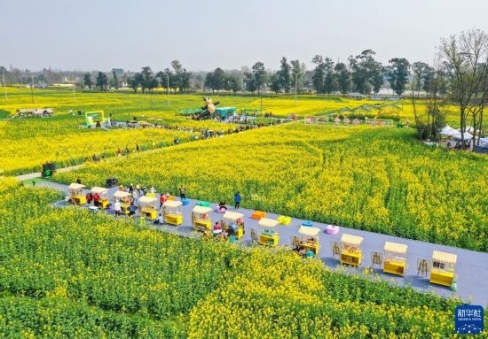 近日,位于四川成都崇州市的數(shù)萬畝油菜花競相綻放,吸引游客前來踏春觀光。