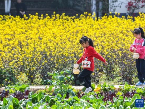 3月5日,在四川省崇州市道明鎮(zhèn),小朋友在油菜花田中玩耍。