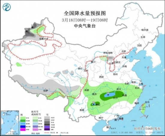 3月18日08時至19日08時,新疆西北部和沿天山地區(qū)、西藏南部和東部、青海南部、山西北部等地部分地區(qū)有小到中雪或雨夾雪,其中,新疆伊犁河谷等地局地有大有暴雪(10~15毫米)。貴州中部和東北部、湖南中北部、江西西北部等地部分地區(qū)有中到大雨(25~45毫米)。