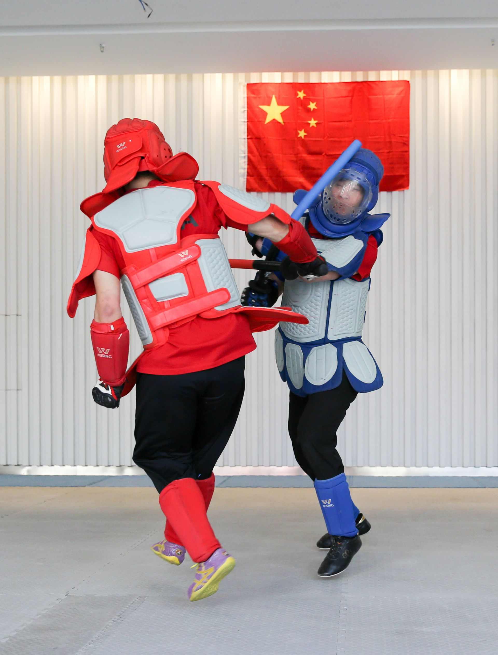 據(jù)了解,2021年,國家體育總局武術(shù)管理中心推出了試行的武術(shù)兵道(短兵)競賽規(guī)則,武術(shù)兵道作為與武術(shù)套路、武術(shù)散打并列的競技武術(shù)重要內(nèi)容在全國普及推廣。同一年,剛剛從北京體育大學武術(shù)專業(yè)畢業(yè)的張宇來到呼和浩特,參與了內(nèi)蒙古第一批武術(shù)兵道運動員的選拔?!耙驗槭切马椖?,大部分隊員都是跨項選拔,主要關(guān)注他們的身體靈活性和臂展?!睆堄钫f。