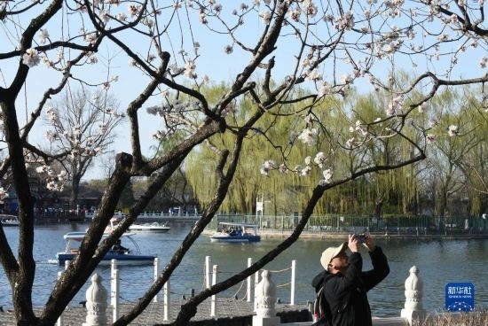 3月25日,一名游客在北京什剎海附近拍攝。