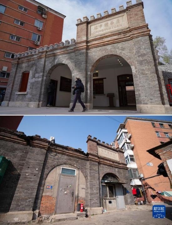 這是一張拼版照片:上圖是修繕后對(duì)外開放的清華園車站舊址(2023年3月25日攝);下圖是修繕前的清華園車站舊址(2021年4月7日攝)。