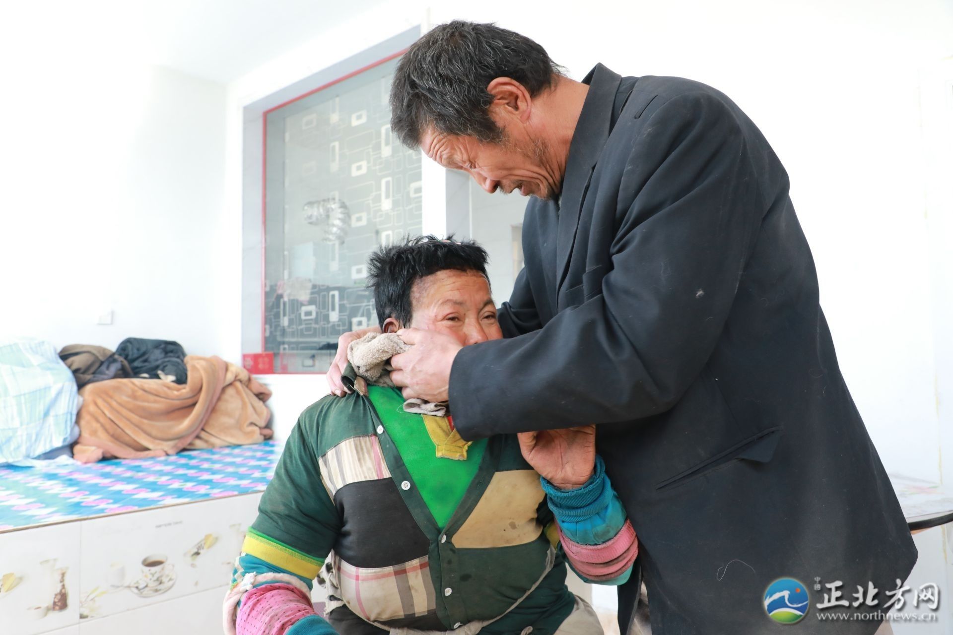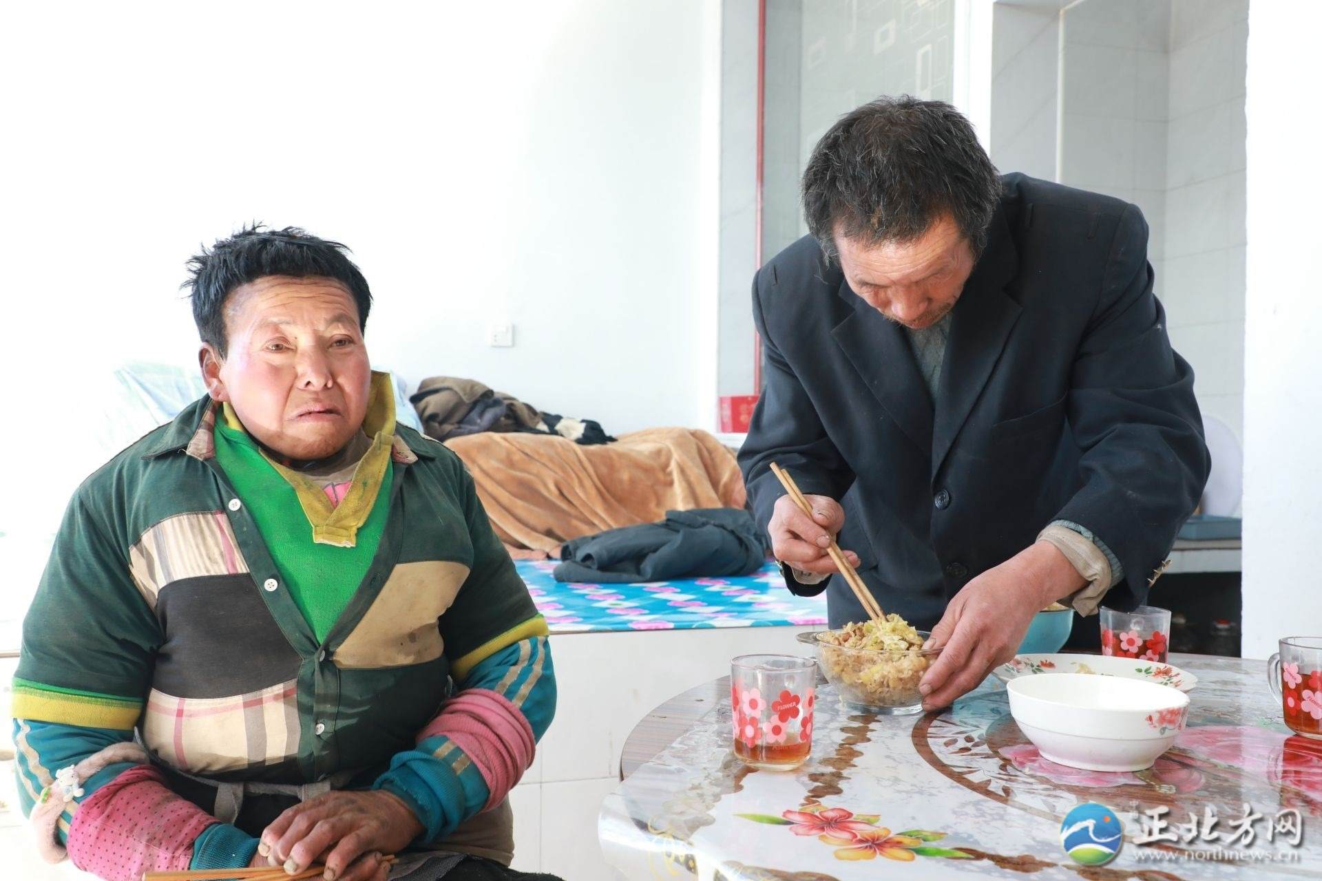 在采訪間隙,何蘭鎖的妻子王林愛回到了家,見到有陌生人顯得很局促。王林愛患有精神疾病,說話顛三倒四。何蘭鎖拿起毛巾,溫柔地為妻子擦拭沾滿灰塵的臉和手,端出早早做好的飯放在桌上:“快吃吧,有你最愛吃的咸菜?!薄傲謵燮鋵嵜羁嗔耍兑捕坏?,我要不在了,她一個人可咋辦呀。我現(xiàn)在最大的心愿是希望能讓她去接受治療?!焙翁m鎖止不住地哽咽道。