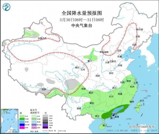 3月30日08時至31日08時,新疆沿天山地區(qū)和伊犁河谷、西藏東部和南部、川西高原北部等地部分地區(qū)有小雪或雨夾雪。廣西東南部、廣東中南部、福建南部等地的部分地區(qū)有中到大雨,局地有暴雨(50~55毫米)。新疆北疆北部等地部分地區(qū)有5~7級風(fēng)(見圖3)。