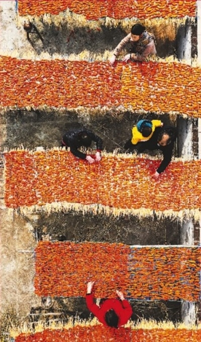 2022年12月16日,湖南省永州市新田縣枧頭鎮(zhèn)大觀堡村,村民在晾曬紅薯干。近年來,該縣利用訂單服務(wù)和農(nóng)村電商平臺(tái),實(shí)現(xiàn)農(nóng)產(chǎn)品線上線下銷售。 劉貴雄攝(人民視覺)