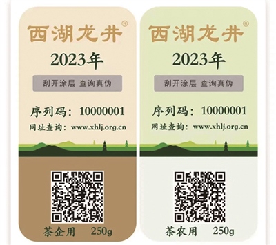 “專用標(biāo)識分為‘證明標(biāo)N(茶農(nóng)用)’和‘證明標(biāo)Q(企業(yè)用)’兩種樣式,相當(dāng)于西湖龍井茶的一張‘身份證’,上面包含了使用主體、年份、規(guī)格、編號、防偽信息等內(nèi)容?!本皡^(qū)執(zhí)法隊(duì)提醒,龍井茶大量上市時(shí)期,購買正宗西湖龍井需認(rèn)準(zhǔn)專用標(biāo)識。