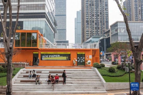 4月28日,在竣工亮相的重慶市九龍坡區(qū)謝家灣街道民主村片區(qū)城市更新項(xiàng)目(一期),人們?cè)谝惶幑部臻g休息(無(wú)人機(jī)照片)。