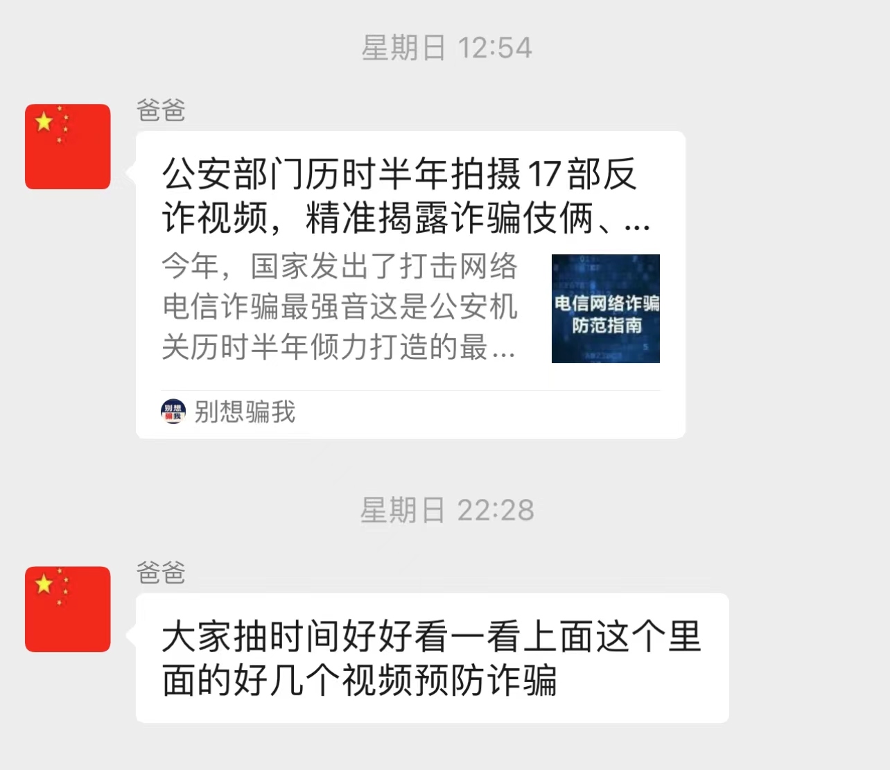 張爸爸表示:“以前我老婆經(jīng)常會(huì)發(fā)一些防詐騙的小視頻推薦給大家,但是大概在2019年后,群里一下子冷清起來,很少有人發(fā)消息,我們分享有趣的事、好看的內(nèi)容,除了我女兒就很少有人回復(fù)了”。