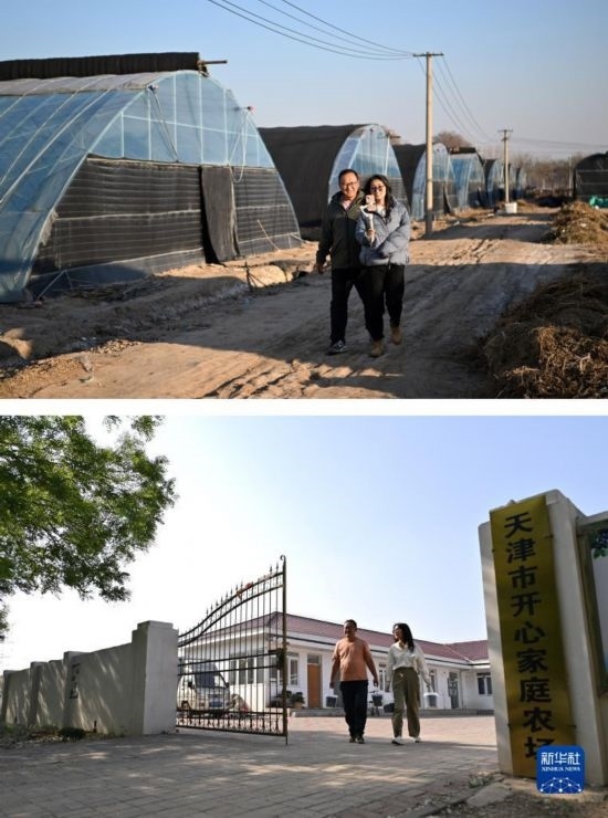 拼版照片:上圖為呂欣和丈夫馮愛喜通過直播介紹自家種植藍莓的大棚(2022年12月6日攝);下圖為呂欣和丈夫馮愛喜一起走出家庭農(nóng)場(5月3日攝)。