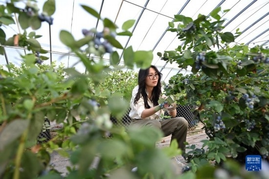 呂欣在大棚內(nèi)采摘藍莓(5月3日攝)。