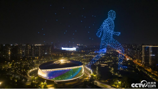 2023年5月13日,杭州亞運(yùn)會乒乓球比賽場地——拱墅運(yùn)河體育公園體育館上空上演無人機(jī)燈光秀表演。