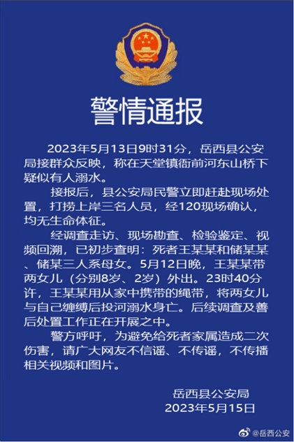 ·安慶警方通報母女三人溺亡:女子將兩女兒與自己纏縛后投河。
