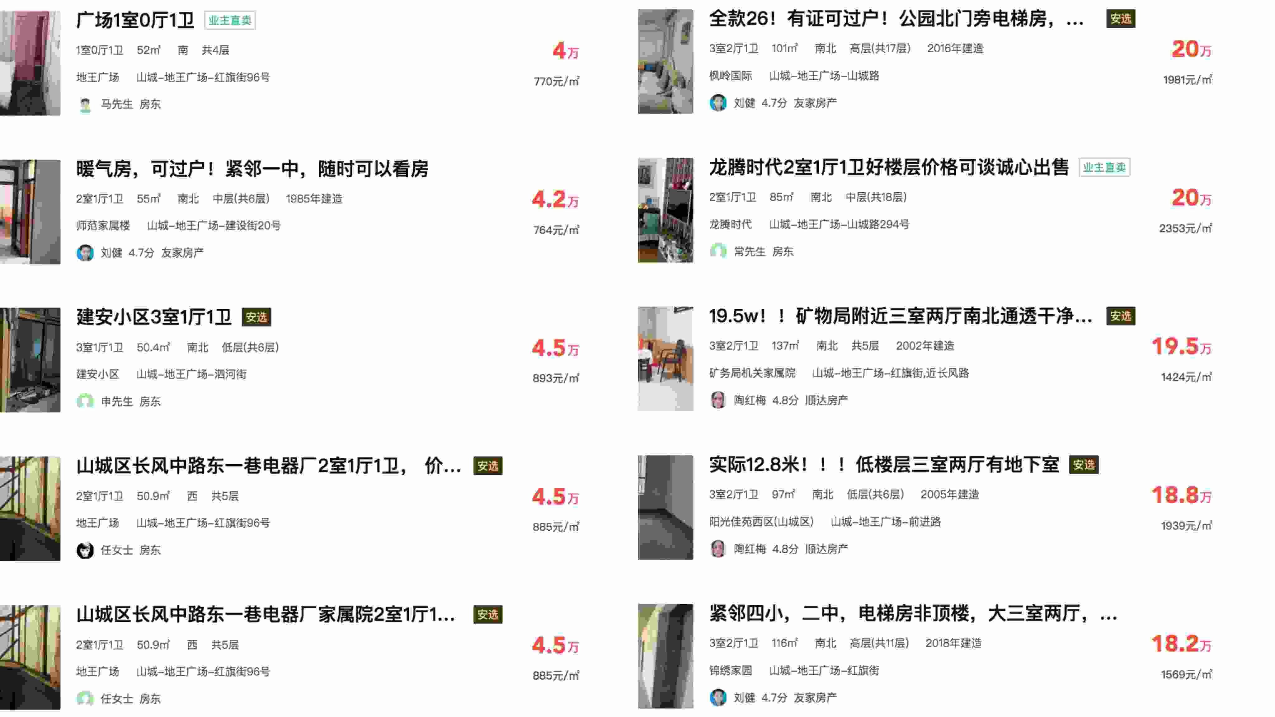 據(jù)安居客平臺(tái),目前,鶴壁山城區(qū)掛牌總價(jià)高一些的房源集中在20萬(wàn)元/套左右。當(dāng)?shù)刂薪槿耸糠Q(chēng),“我沒(méi)有遇到過(guò)1000元一套的房子。鶴壁市老城區(qū)的房子均價(jià)相對(duì)低一些,但新城的房?jī)r(jià)基本都在7000元/平方米左右,不可一概而論。”