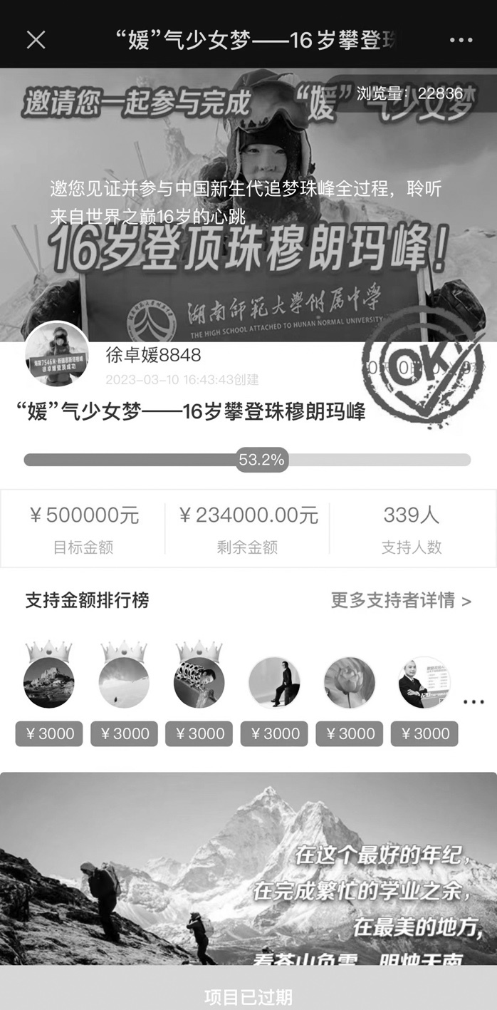 5月15日,揚子晚報紫牛新聞記者再次點開徐卓媛當初發(fā)起助力登峰的眾籌鏈接,發(fā)現該項目已過期,籌款進度最終定格在53.2%,最終籌集到資金266000元。除去徐江雷朋友們贊助的這二十多萬元,據了解,還有一些企業(yè)也出資贊助了徐卓媛登頂珠峰的活動。徐江雷此前告訴記者,江蘇一家藥企看到此前揚子晚報對于徐卓媛的報道后(本報今年3月17日刊登《眾籌50萬,助16歲女兒挑戰(zhàn)珠峰》一文),被她小小年紀敢于攀登高峰的精神所打動,秉承著“少年強則國強”的理念,慷慨贊助徐卓媛登山資金30萬元。
