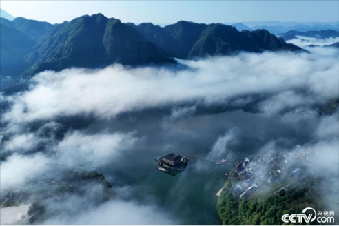 2023年5月18日,重慶酉陽(yáng)縣酉水河鎮(zhèn)河灣山寨,晨霧下的酉水河風(fēng)光。