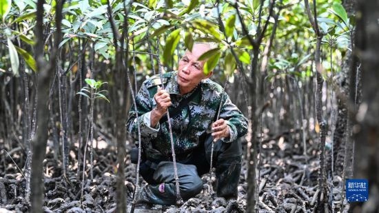 莫積瑞老人護(hù)理紅樹林小苗(5月20日攝)。
