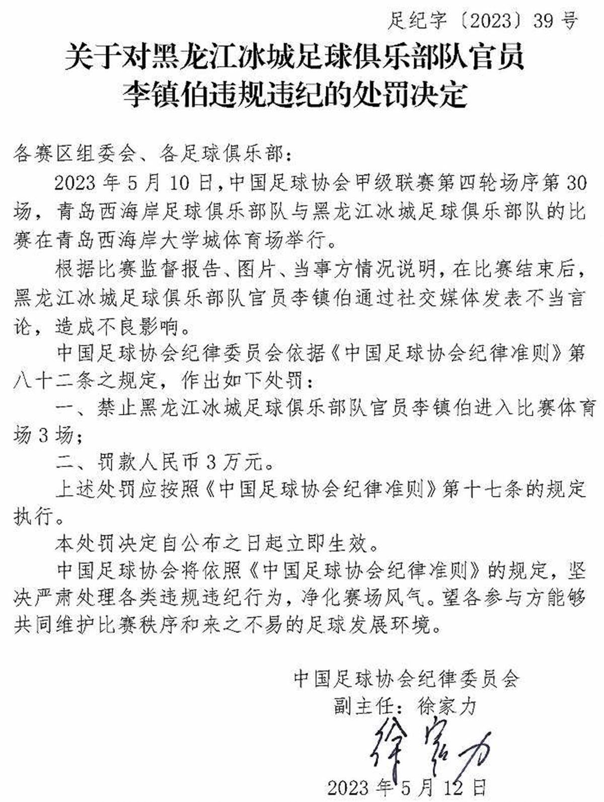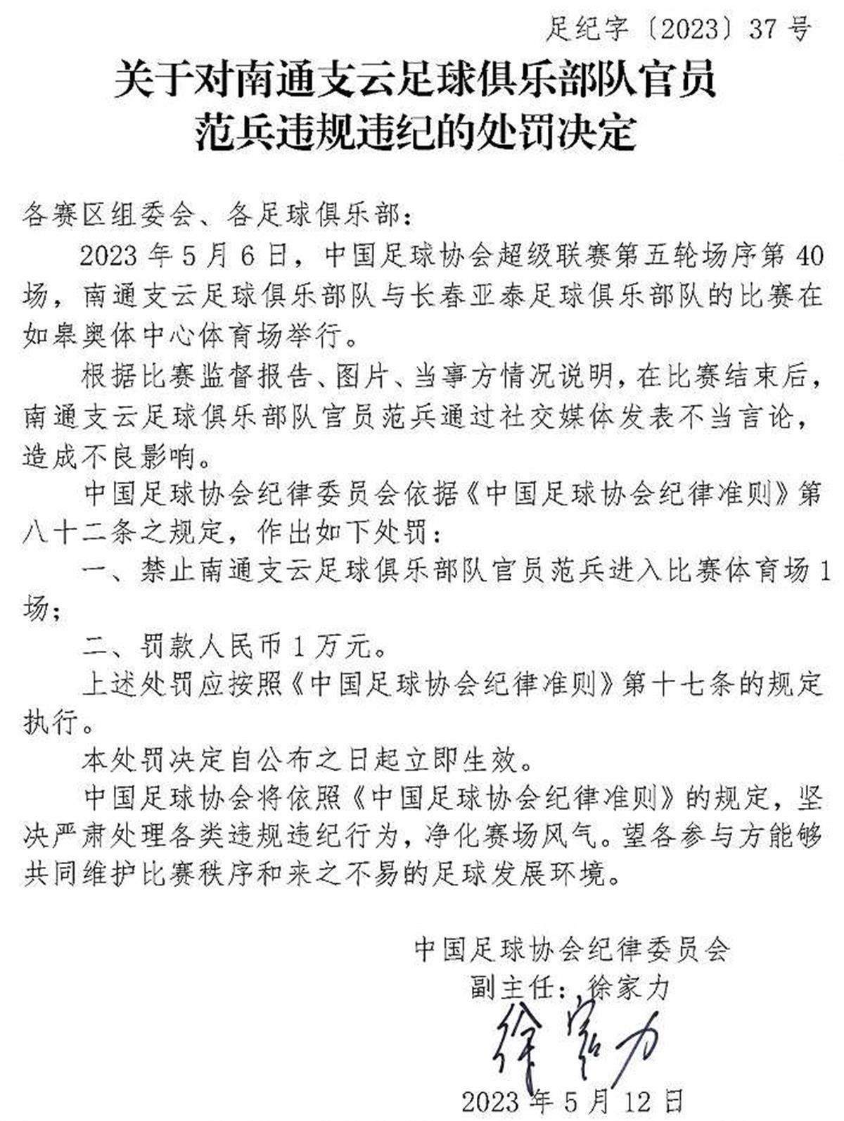 中國足協(xié)紀(jì)律委員會根據(jù)裁判員報告、比賽監(jiān)督報告、視頻、當(dāng)事方情況說明及聽證,認(rèn)定楊帆實(shí)施暴力行為,于是依據(jù)《中國足球協(xié)會紀(jì)律準(zhǔn)則》第五十三條、第四十八條之規(guī)定,對他給予停賽4場、罰款人民幣4萬元的處罰。在這張罰單上,第一次出現(xiàn)了徐家力的名字。從這張罰單來看,中國足協(xié)紀(jì)律委員會定下了基調(diào),那就是嚴(yán)厲打擊球場暴力行為。