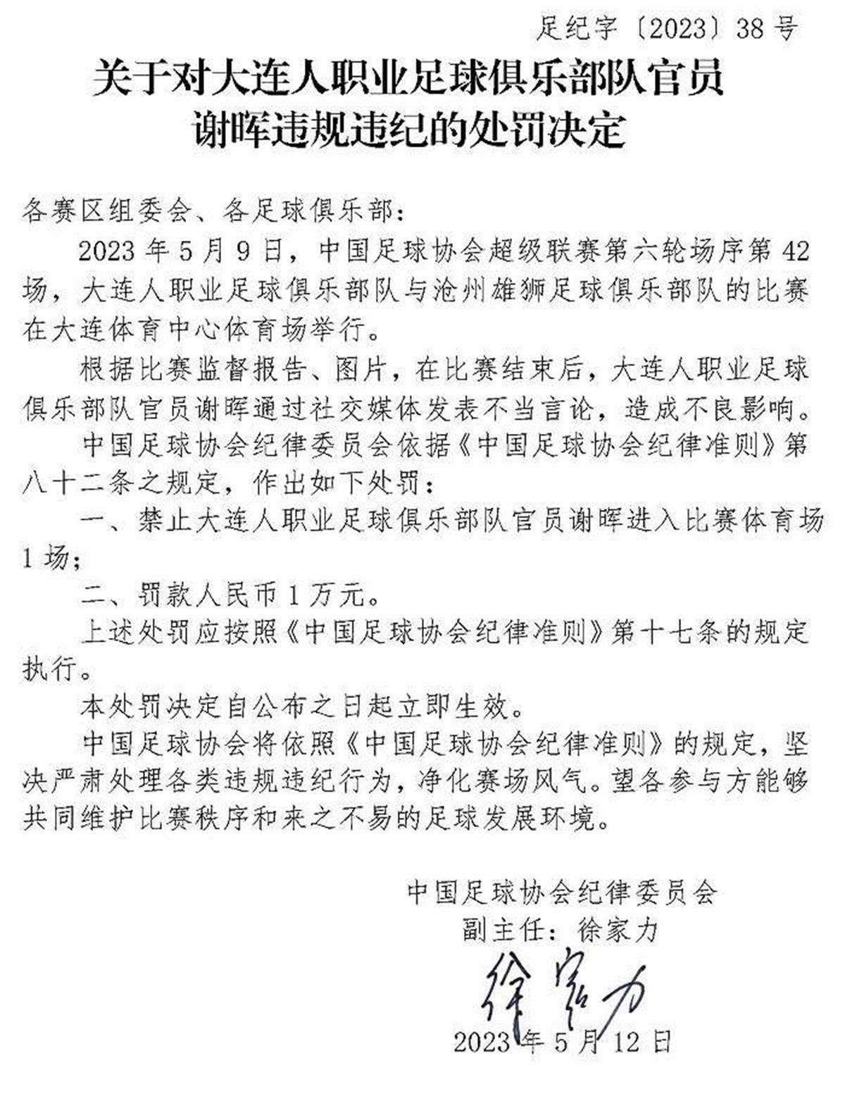 5月12日,中國足協(xié)紀(jì)律委員會接連開出三張罰單,對中超大連人隊(duì)的主教練謝暉,以及南通支云隊(duì)、黑龍江冰城隊(duì)的兩位俱樂部官員范兵和李鎮(zhèn)伯進(jìn)行了處罰,共計罰款5萬元,并對三人追加禁賽。這三張罰單一出,引來外界的一片質(zhì)疑聲。