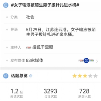 據(jù)微信號“網信連云港”6月1日消息,近日,一條涉連云港“女子輸液被陌生男子拔針扎進水桶”的新聞,引發(fā)多家媒體轉載報道,相關話題沖上各大平臺熱榜。