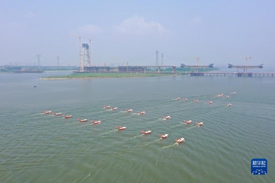 這是6月2日在水域救援實戰(zhàn)演習(xí)現(xiàn)場拍攝的消防舟艇編隊(無人機(jī)照片)。