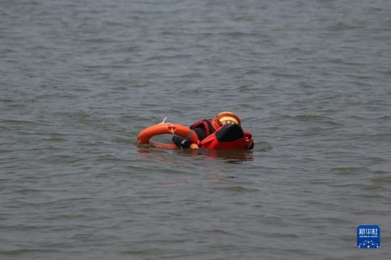 6月2日,在水域救援實戰(zhàn)演習(xí)現(xiàn)場,一名模擬被困人員依靠智能水上救生遙控機(jī)器人回到岸邊。