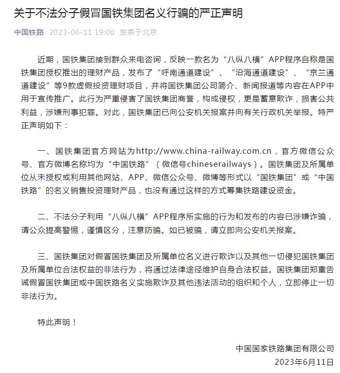 “中國鐵路”微信公眾號6月11日發(fā)布嚴正聲明稱,近期,國鐵集團接到群眾來電咨詢,反映一款名為“八縱八橫”APP程序自稱是國鐵集團授權推出的理財產品,發(fā)布了“呼南通道建設”、“沿海通道建設”、“京蘭通道建設”等9款虛假投資理財項目,并將國鐵集團公司簡介、新聞報道等內容在APP中用于宣傳推廣。