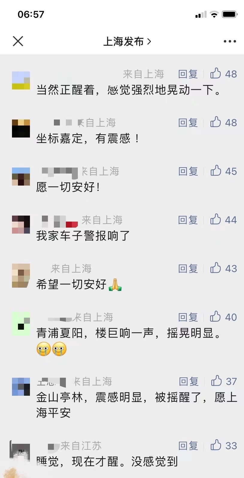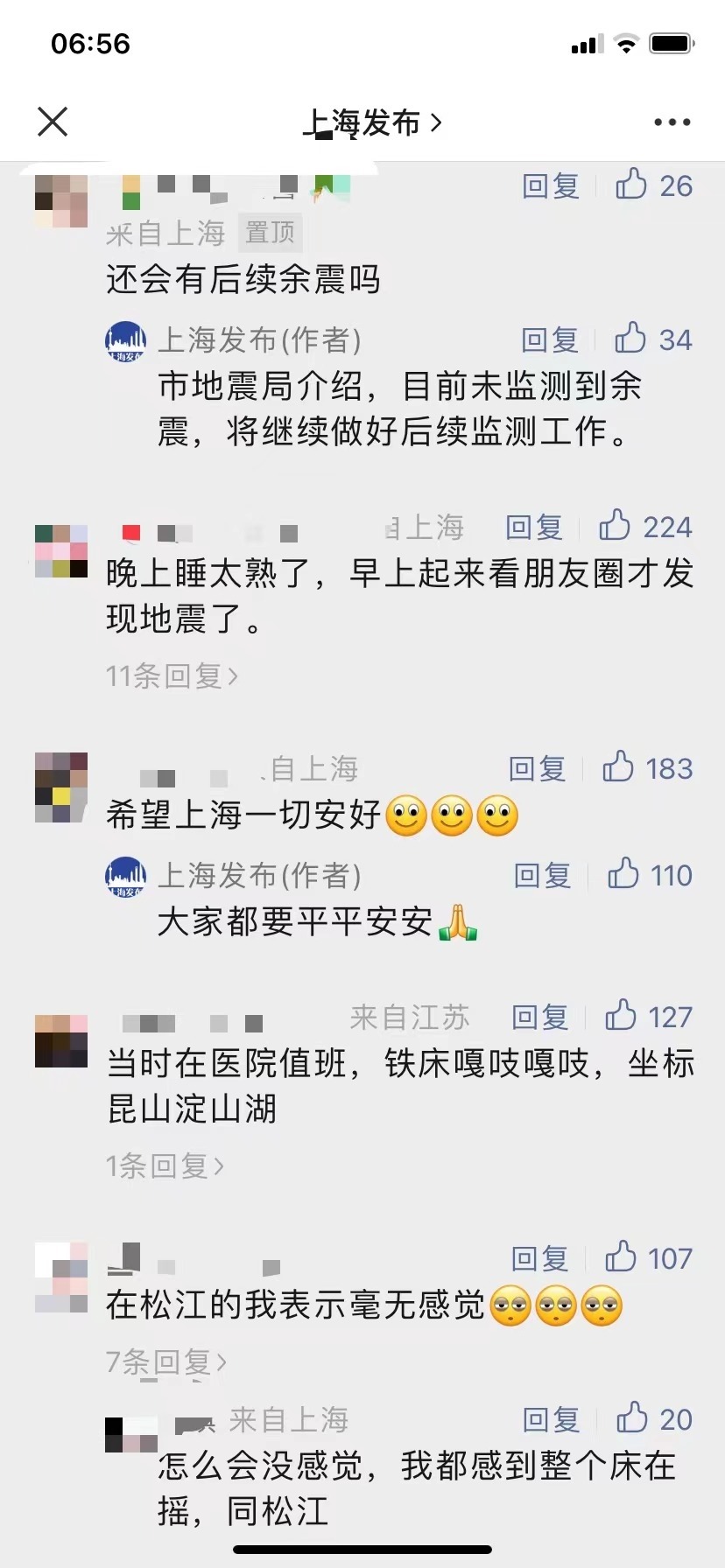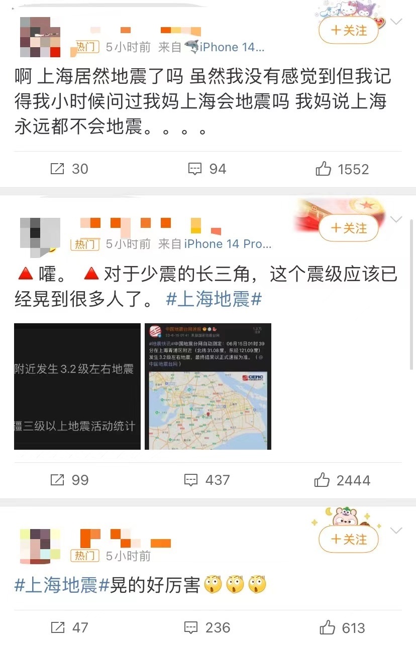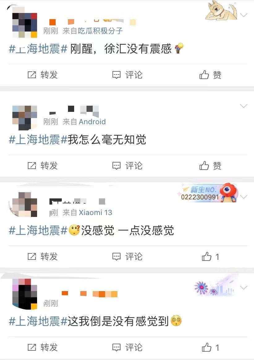 有網(wǎng)友表示,“床明顯在晃動(dòng)”“持續(xù)了四五秒”“徐匯輕微有震感”,不過也有很多網(wǎng)友表示,“在睡夢(mèng)中完全沒有感覺到”。